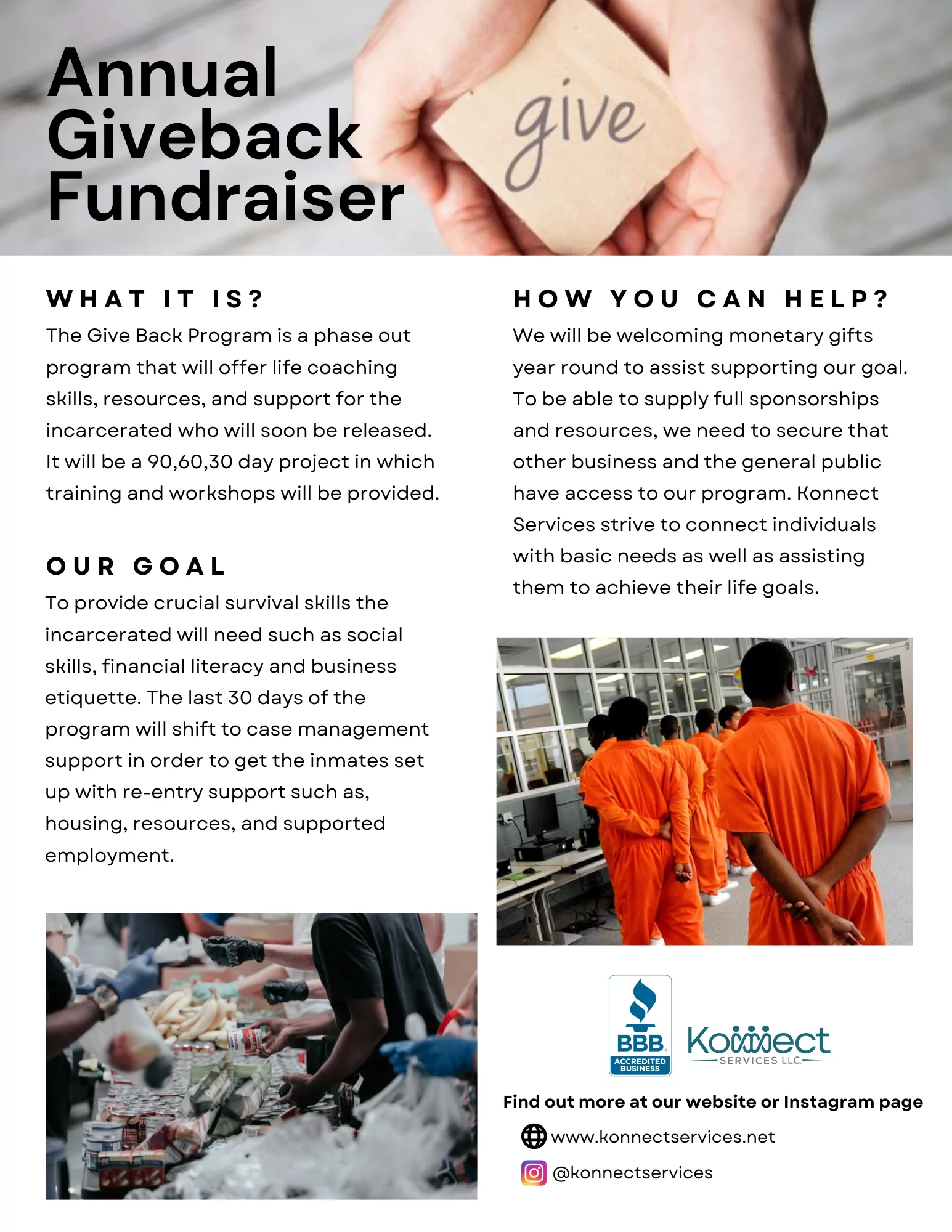 The Give Back Program is a phase out program that will offer life coaching skills, resources, and support for the incarcerated who will soon be released. It will be a 90,60,30 day project in which training and workshops will be provided. Our goal is to provide crucial survival skills the incarcerated will need such as social skills, financial literacy and business etiquette.